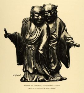 Parmi ces artistes inspirés par le Japon, il faut citer en premier lieu Henri Guérard dont l’œuvre, gravée ou peinte, trouve ses références aussi bien dans l’art occidental que dans l’art d’Extrême-Orient. Au-delà de son interprétation d’œuvres d’artistes occidentaux, anciens ou modernes, qu’Henri Guérard peut reproduire par le procédé de la gravure, il est également celui qui s’est attelé à copier « les pièces des collections Cernuschi, Burty, Gonse et Bing, […].[14] » Fénéon se réfère ici à la collaboration d’Henri Guérard à la publication de L’Art japonais de Louis Gonse en 1883, pour laquelle l’artiste réalisa une grande partie des illustrations.